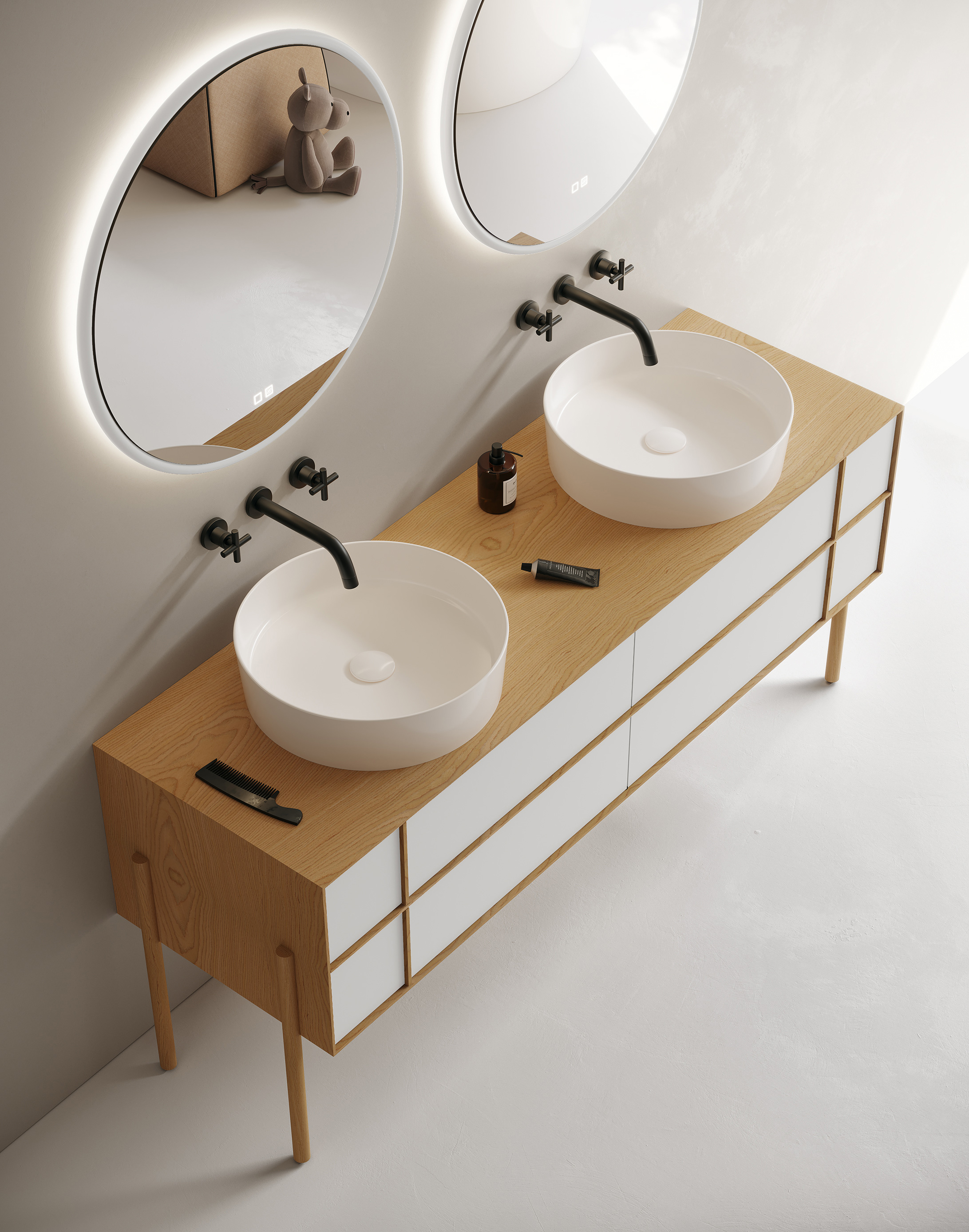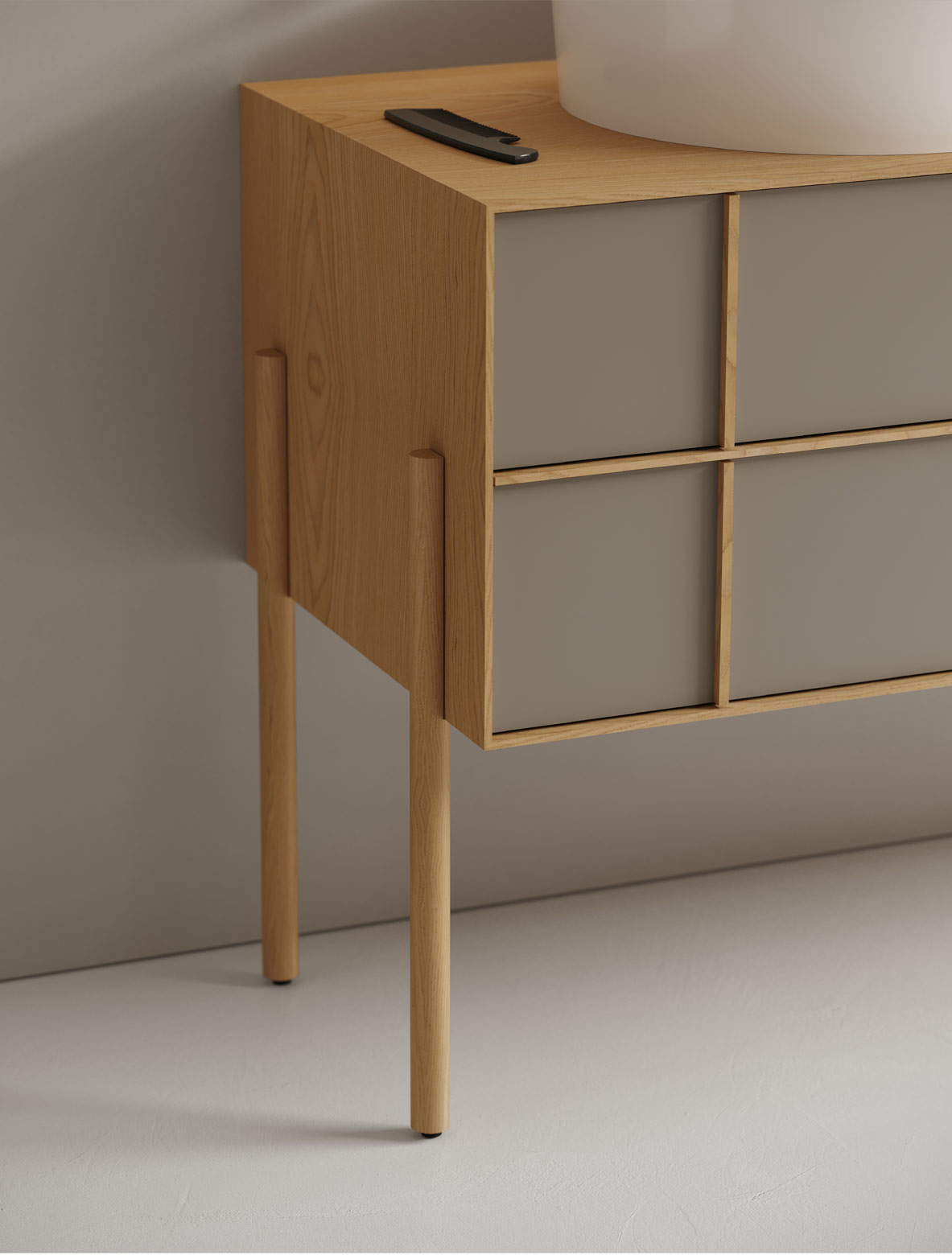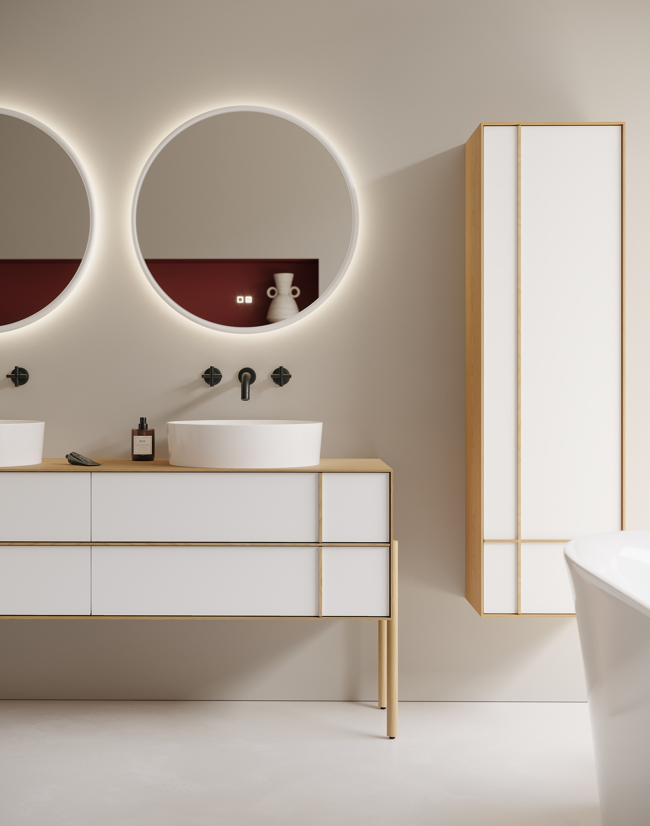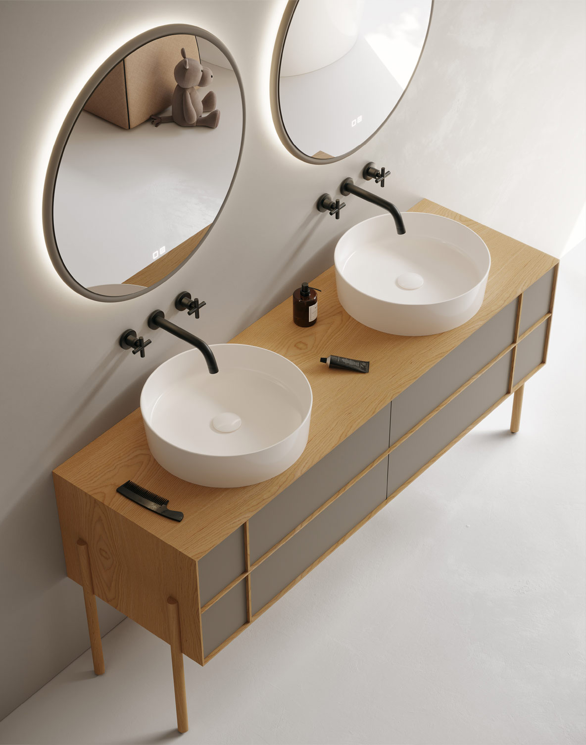KATSURA bathroom cabinet, bearing the signature of Setsu & Shinobu Ito, is a magnificent masterpiece that harmoniously blends striking aesthetics with functionality. Every detail of the design has been meticulously considered, adding a unique elegance and simplicity to the atmosphere of your bathroom.